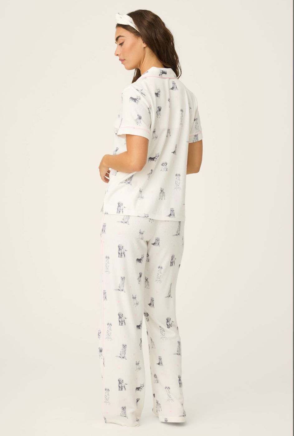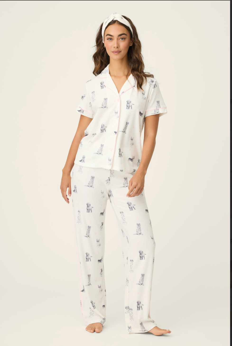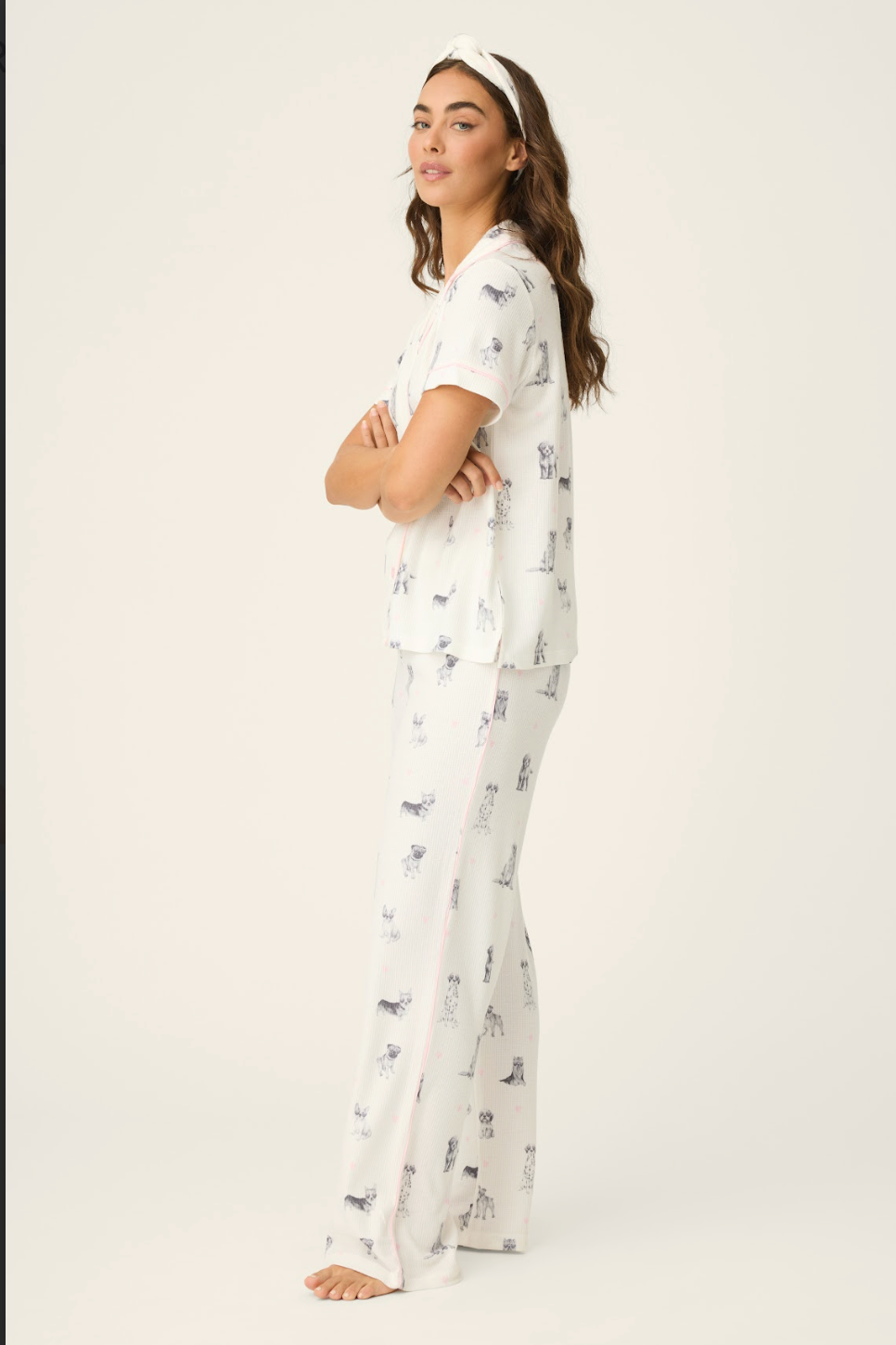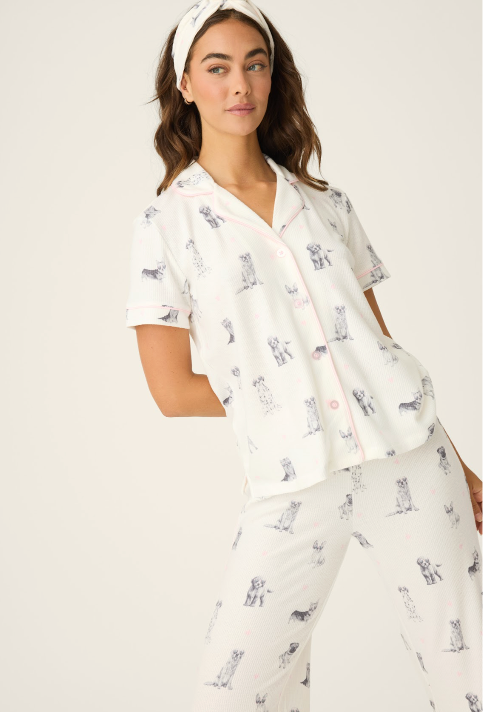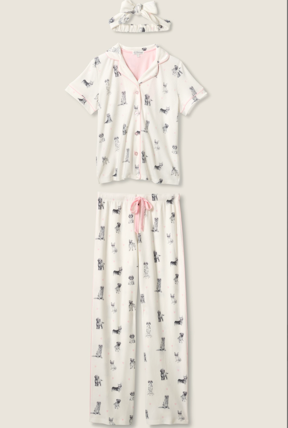 Women’s two-piece pajama set in soft ivory with allover Valentine dog print