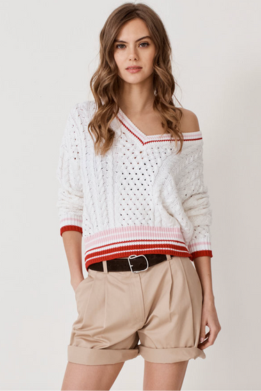 Designed in a crisp white base with bold red contrast trim, this sweater features a textured mix of pointelle and cable knit detailing that adds dimension and visual interest. The relaxed V-neckline can be worn on or slightly off the shoulder, giving it an easy, modern feel.