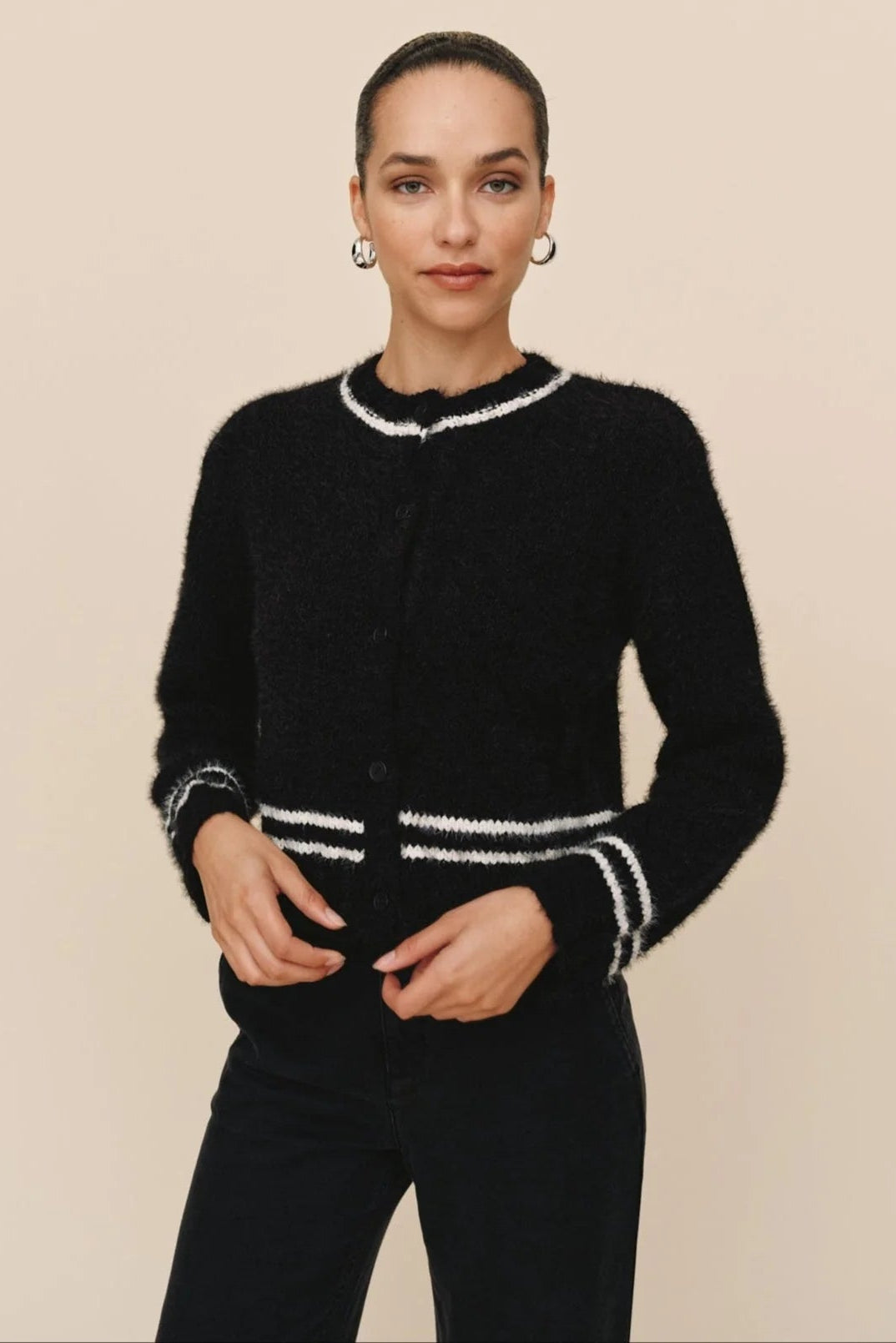 Classic with a twist, the Contrast Stripe Cardigan is a fitted layer elevated by contrast stitching, giving a modern edge to a timeless knit. Long sleeves provide coverage with a sleek fit, while a button-front closure ensures versatile wear. Two front pockets add function, and the contrast stitching delivers subtle statement detail.