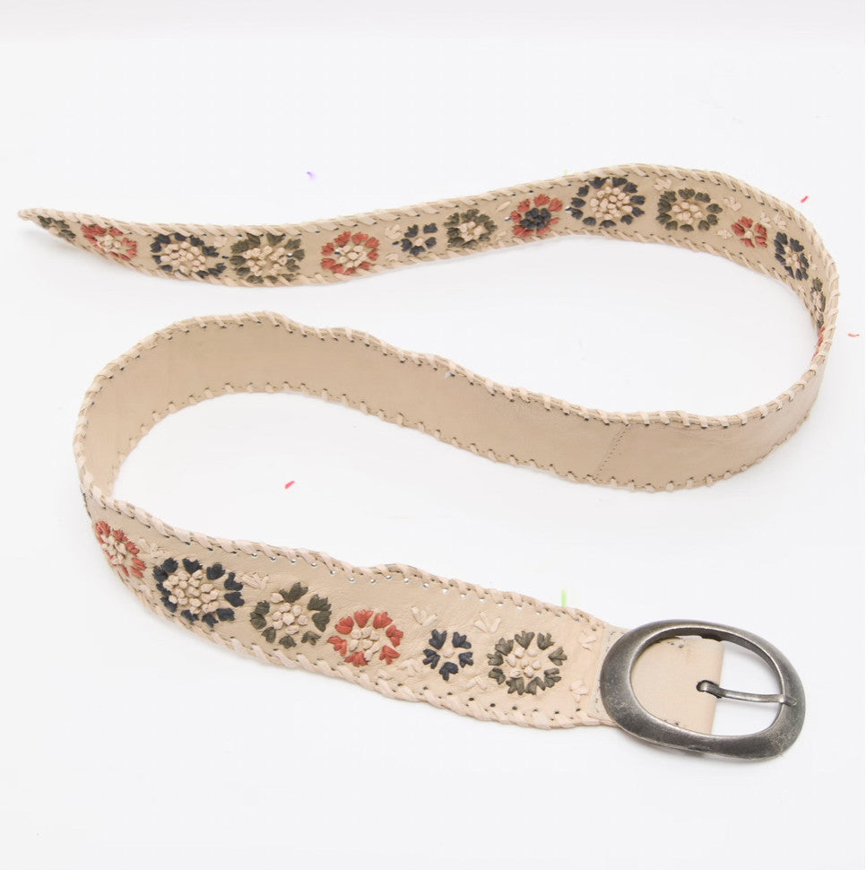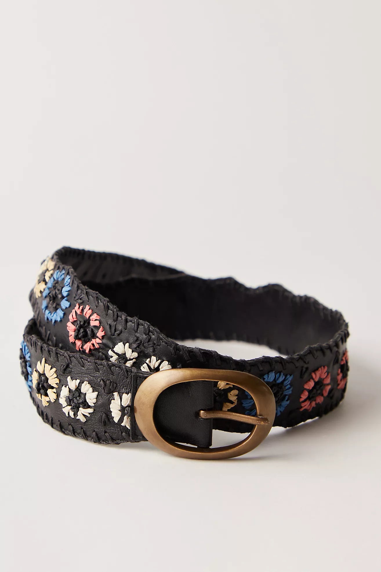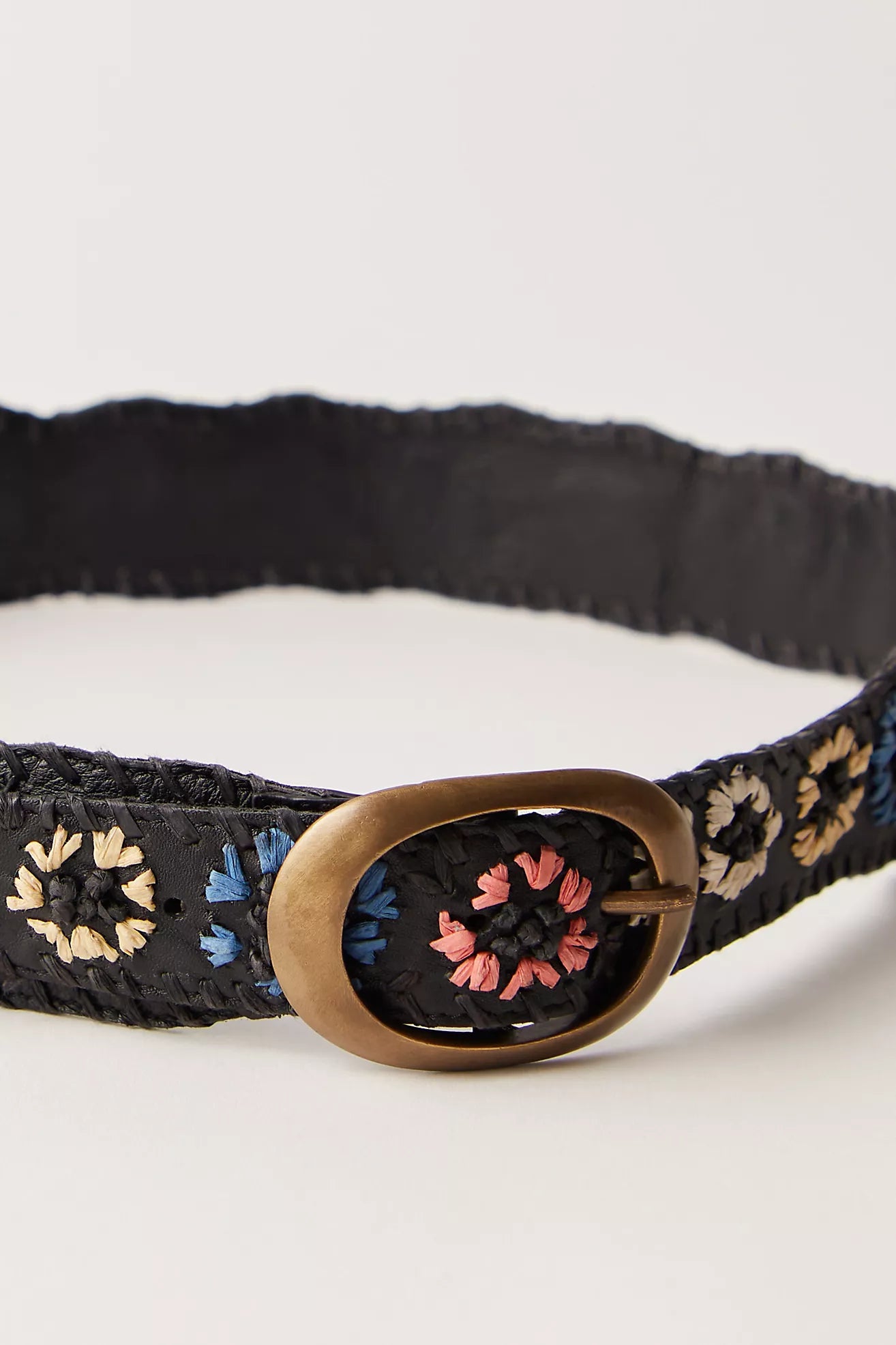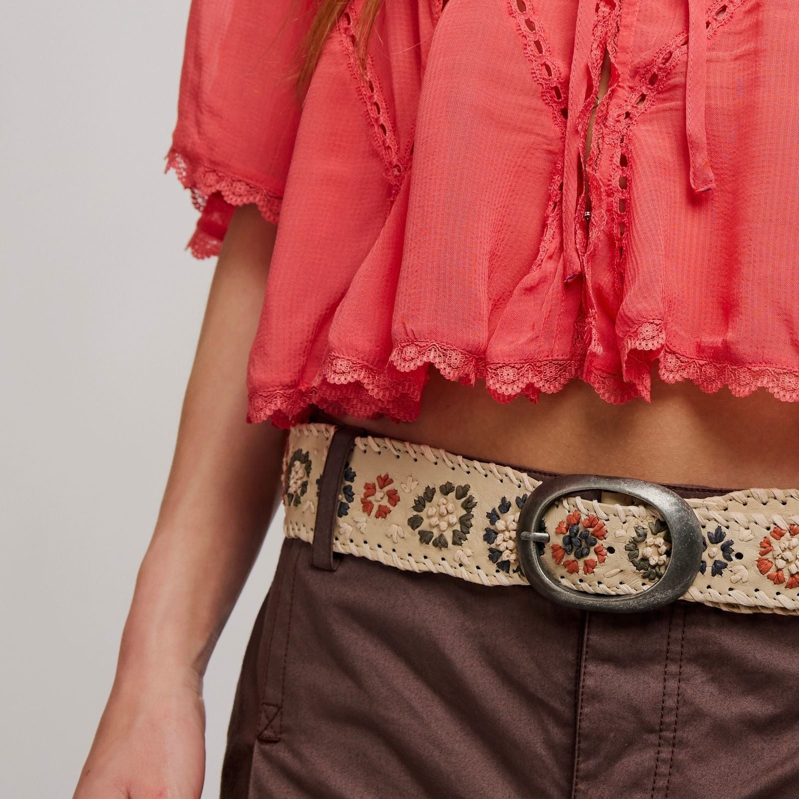 Playful yet polished, this leather belt from the FP Collection is adorned with woven raffia trim and delicate floral detailing for a unique, artisan-inspired finish. The blend of texture and craftsmanship adds standout charm to any outfit, whether styled with denim or cinched over a flowing dress.