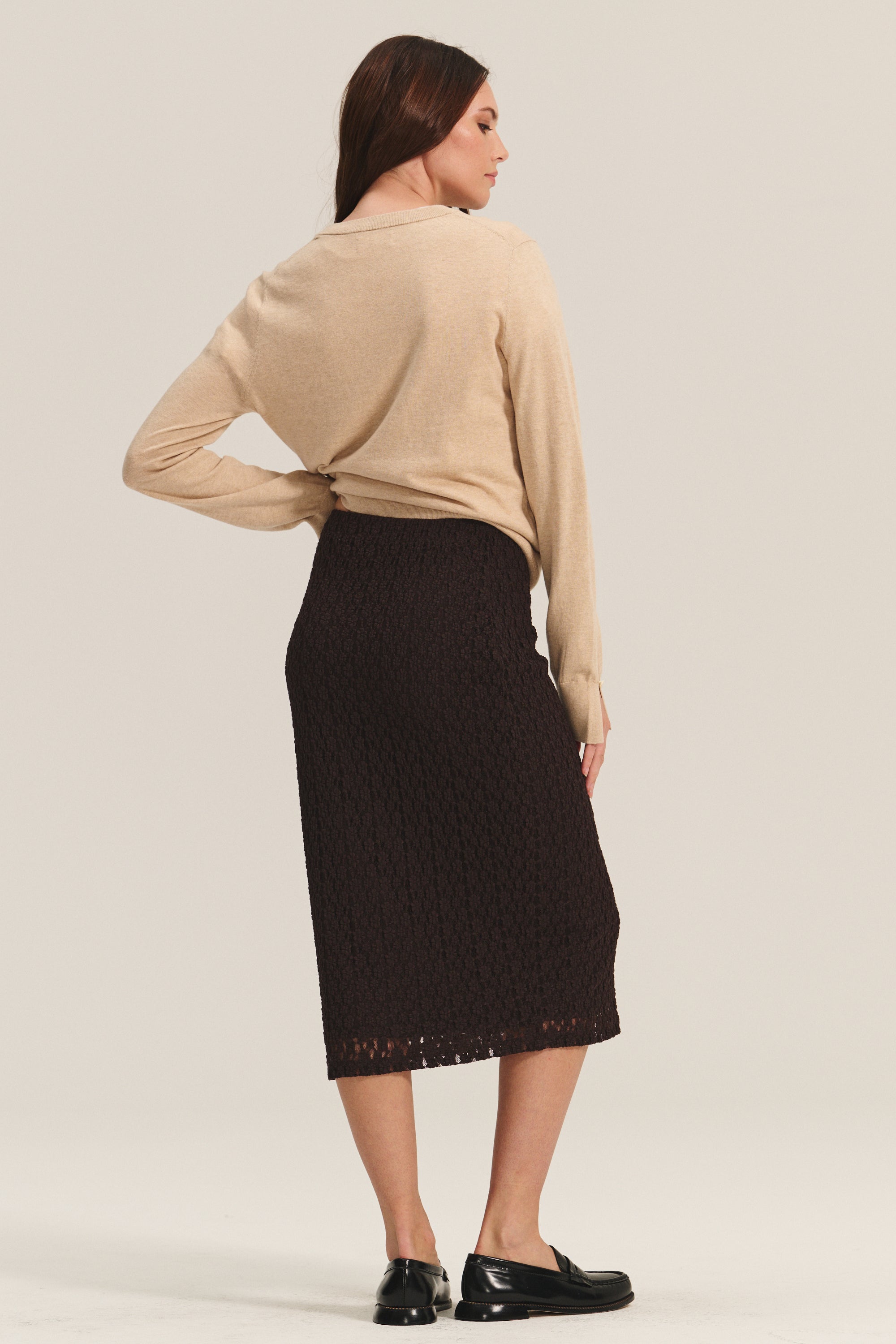 Stretch lace midi skirt featuring a refined, body-skimming silhouette that falls below the knee. Designed with an elastic waistband for a smooth fit and effortless comfort. The intricate lace texture adds subtle dimension, creating a timeless yet modern look. Fully lined for coverage with a hint of stretch for easy movement.
