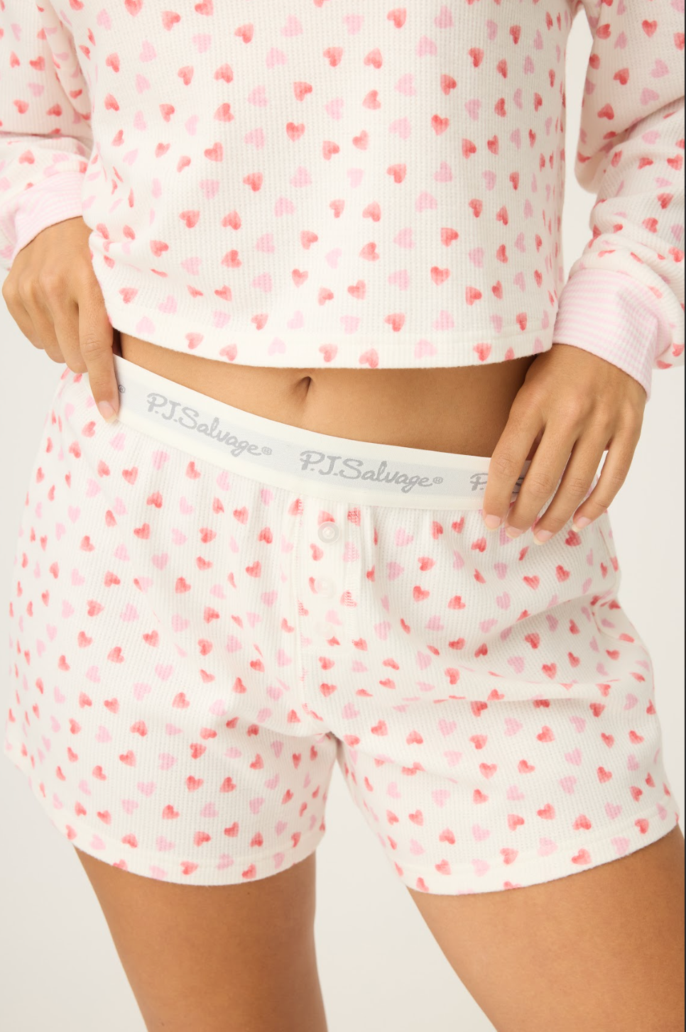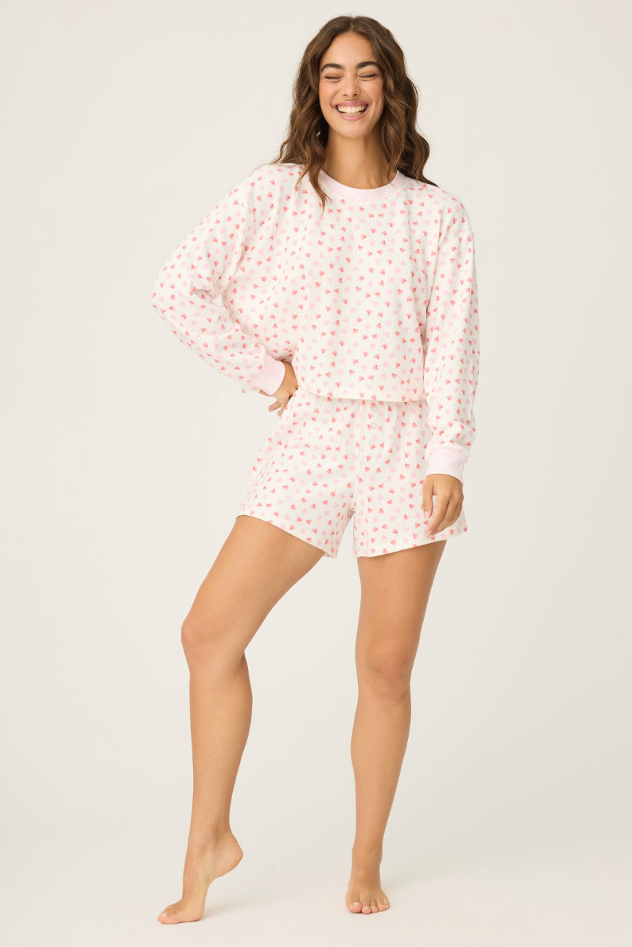 relaxed fit with ribbed crewneck and cuffs, while the coordinating shorts have an elastic drawstring waistband for comfort. A whimsical and cozy choice for lounging or catching some extra z’s.