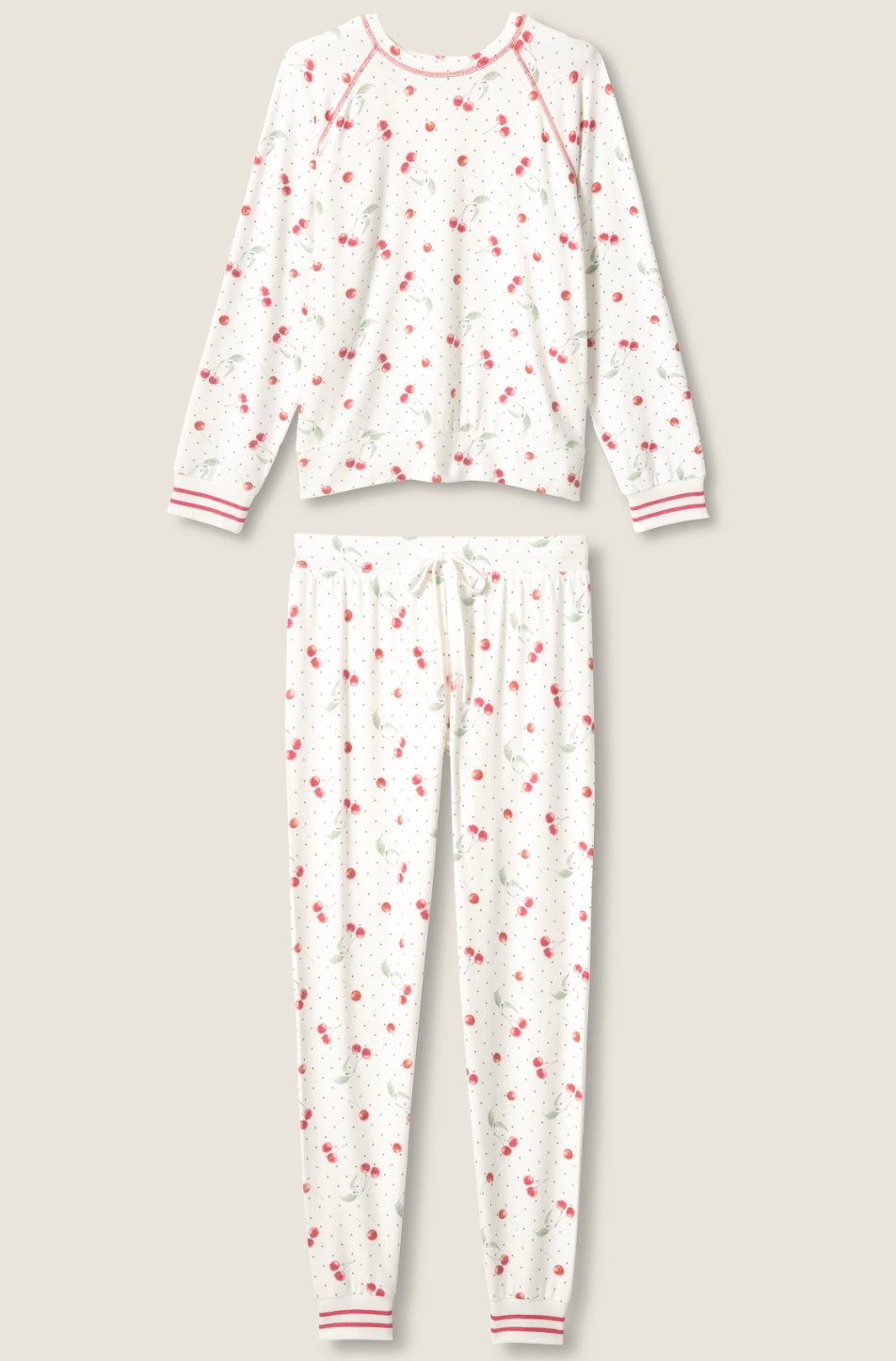 Cozy meets playful in this Ivory two-piece pajama set. Crafted from soft, stretchy baby peachy waffle, it features a long-sleeve top and matching jogger-style bottoms with a drawstring waist. Printed with charming cherries across a crisp white background and finished with pink piping details, this set is perfect for lounging, slow mornings, and relaxing nights in.