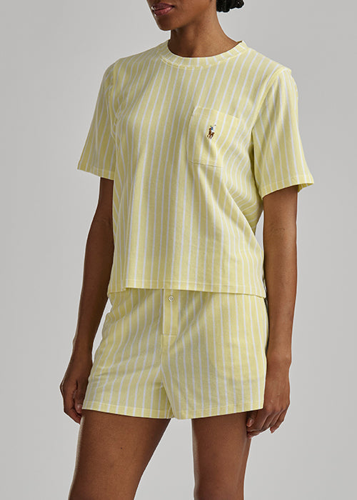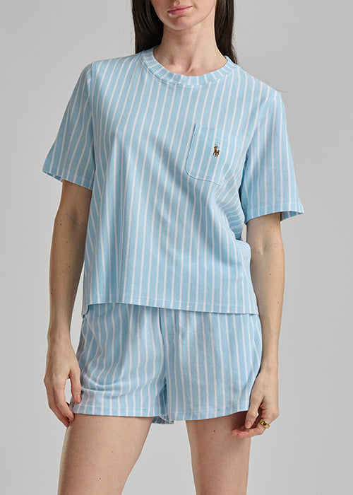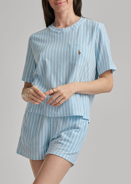 Classic and sporty, the Club Stripe Cotton Short Set is crafted from 100% breathable cotton for lightweight comfort. Designed with timeless vertical striping, this set features a relaxed short sleeve crewneck top with a chest patch pocket and signature embroidered Pony.