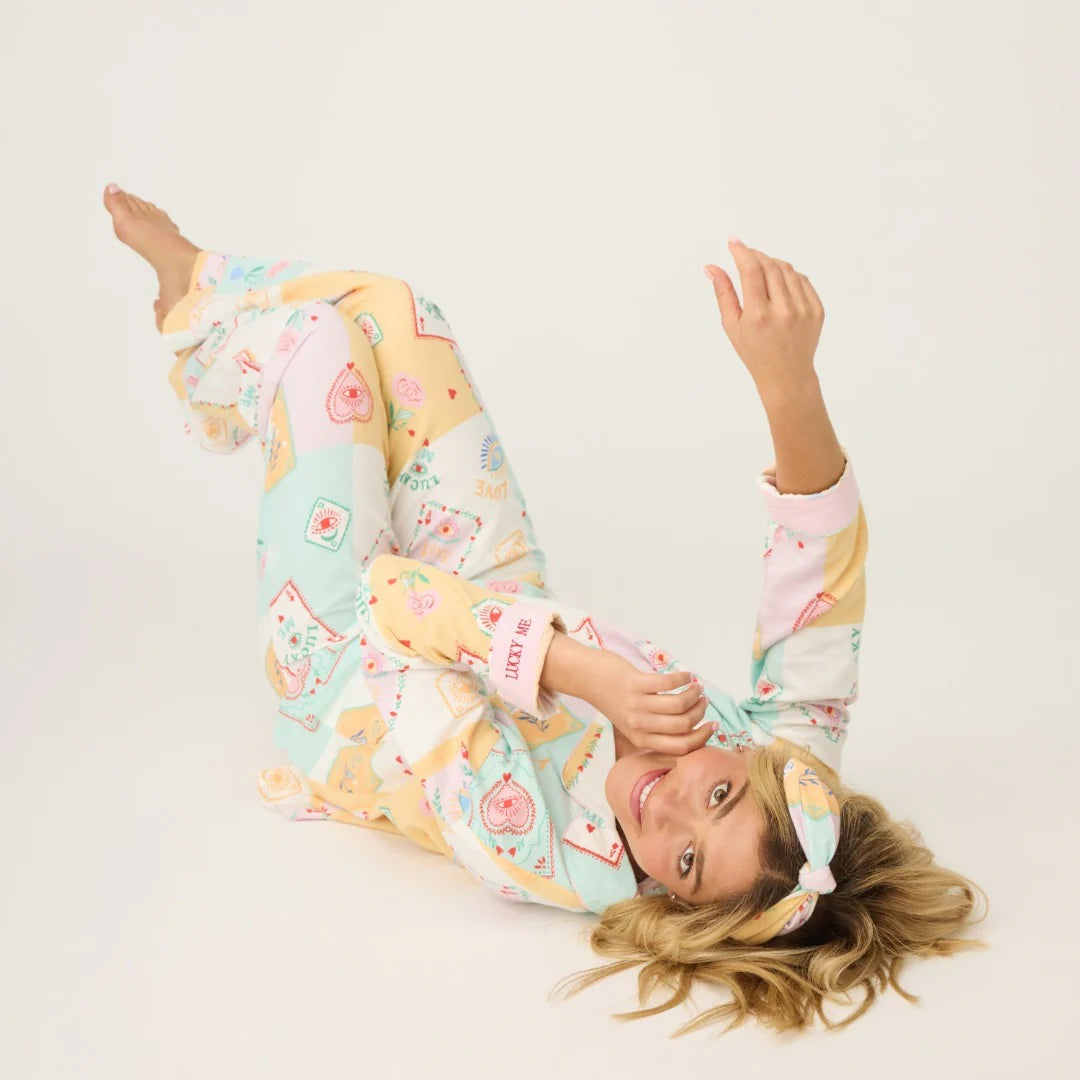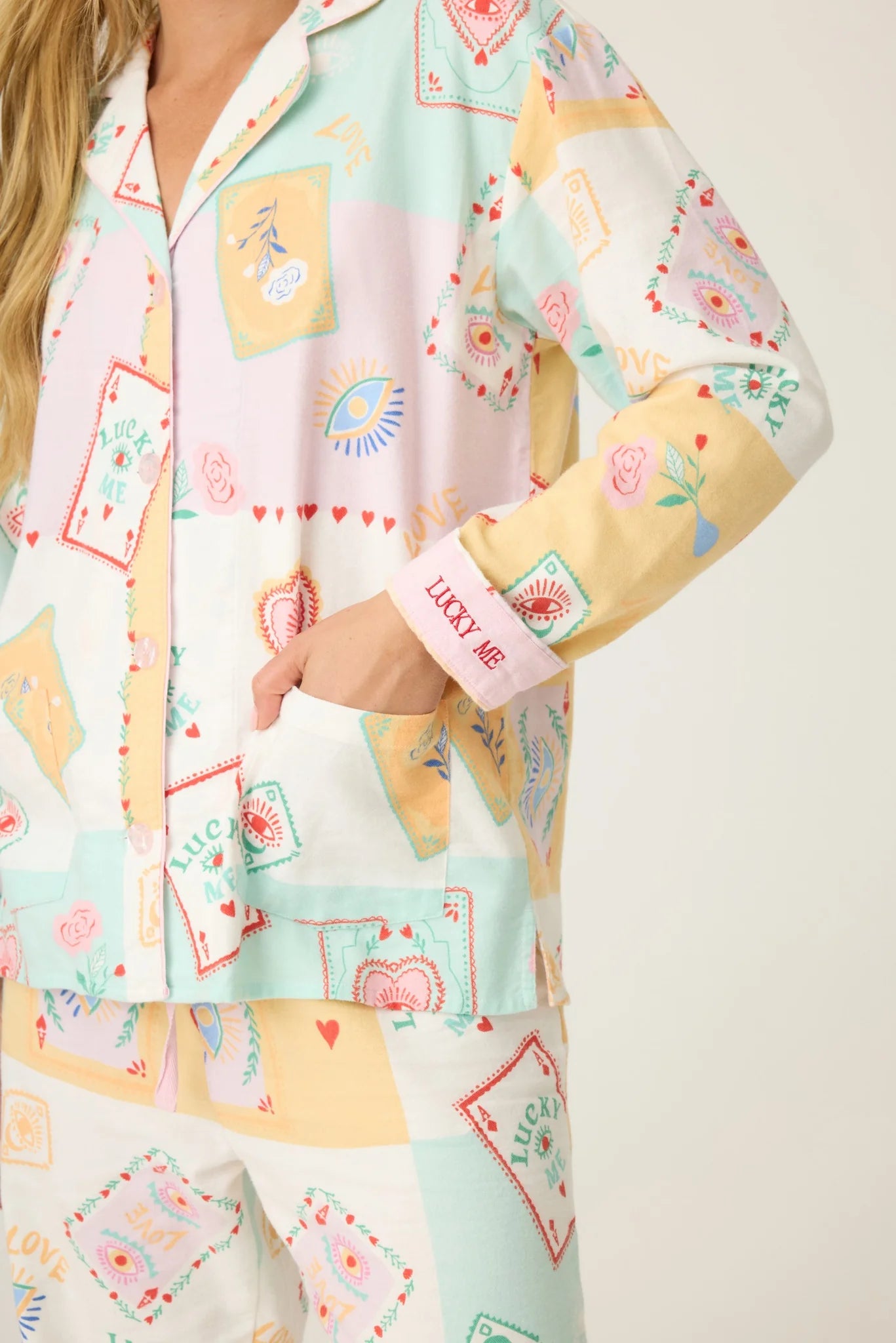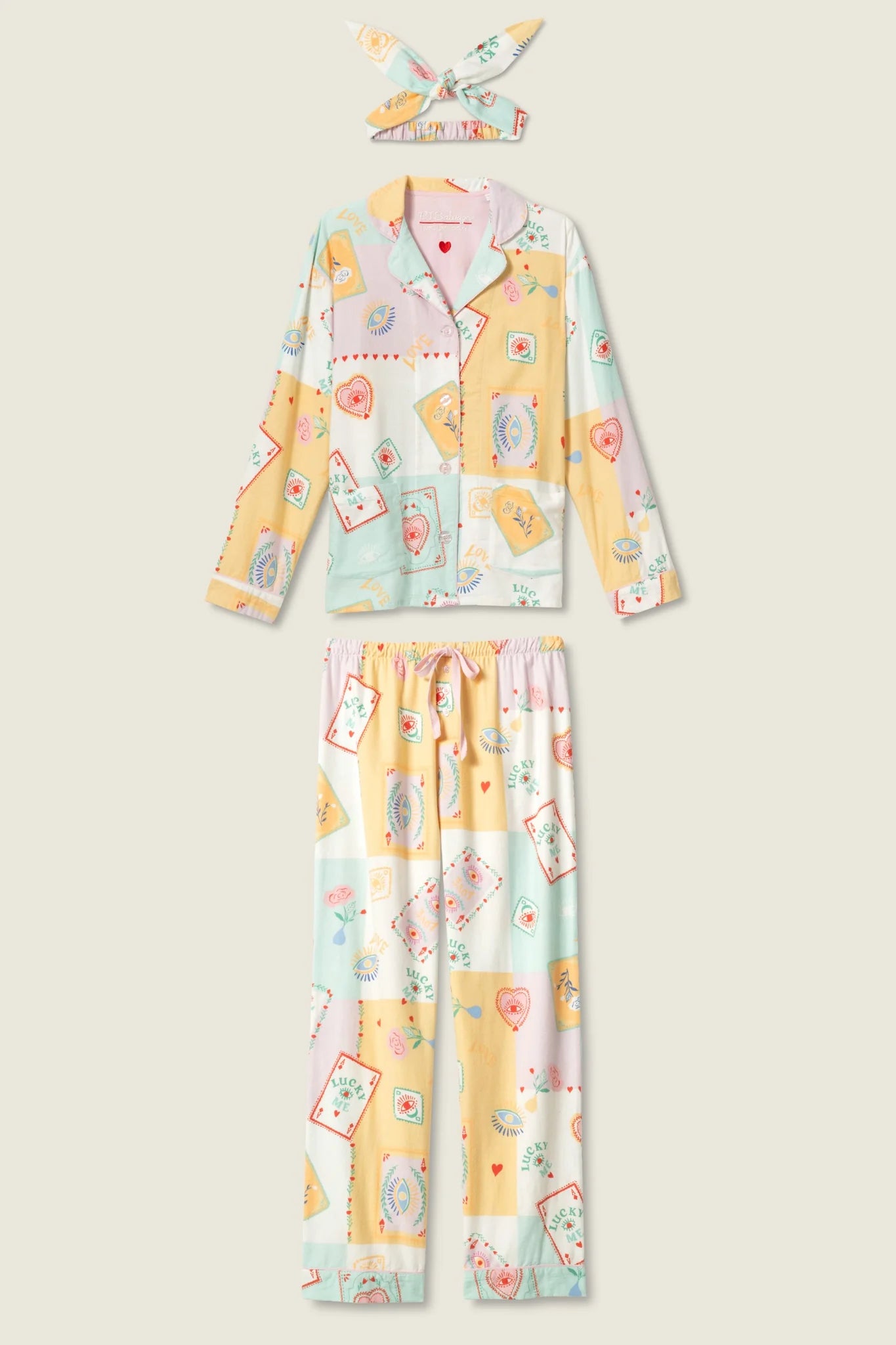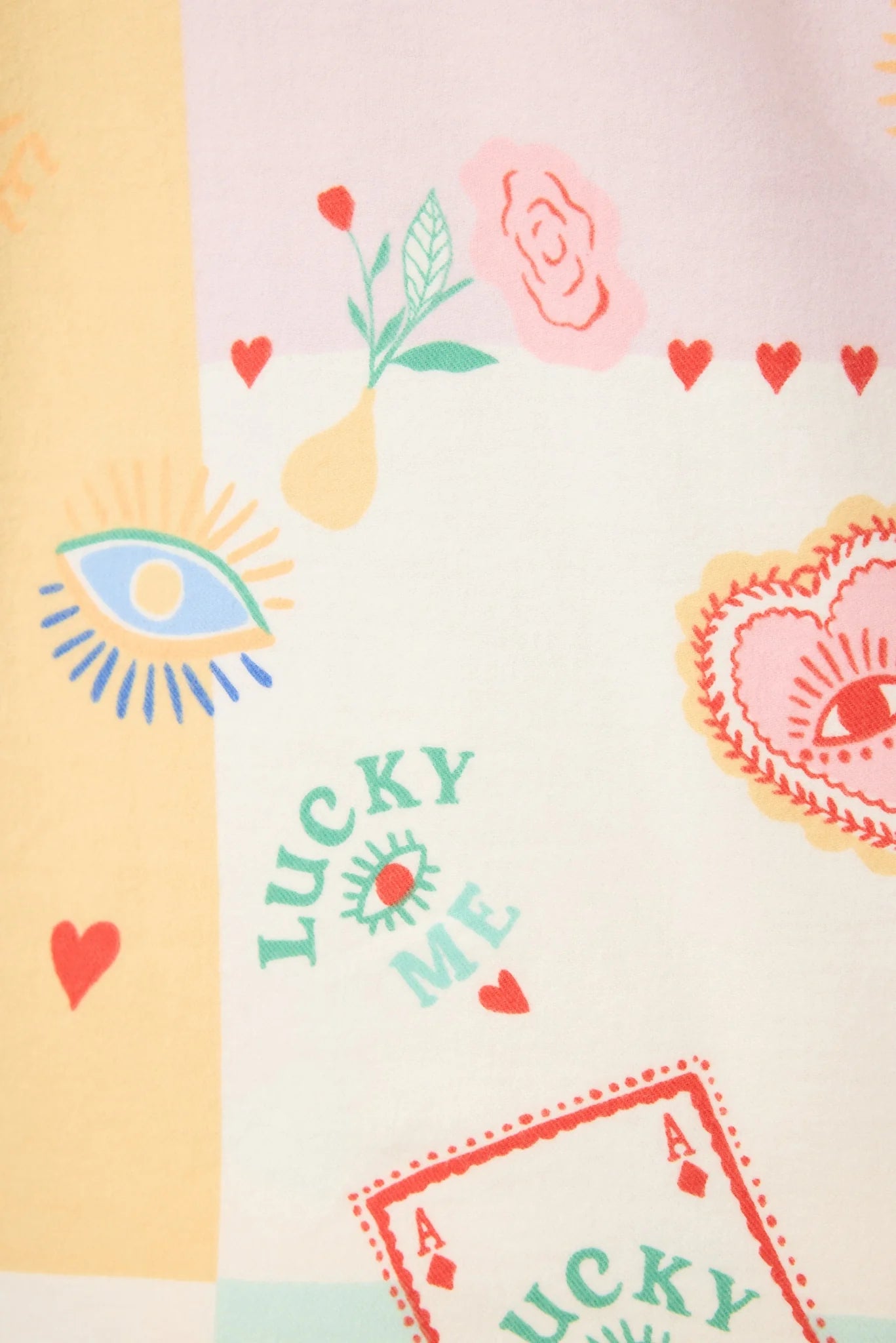 A winning hand for cozy days. This ivory pajama set—crafted from soft cotton flannel—pairs a button-up top with straight-leg pants in an allover print of whimsical playing cards, hearts, lucky eyes, and sweet little charms. Perfect for curling up with a book, sipping tea, or dealing out a round of cards with friends.
