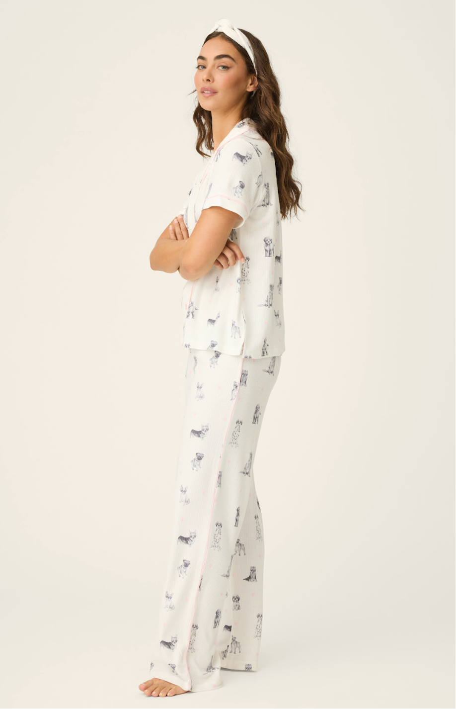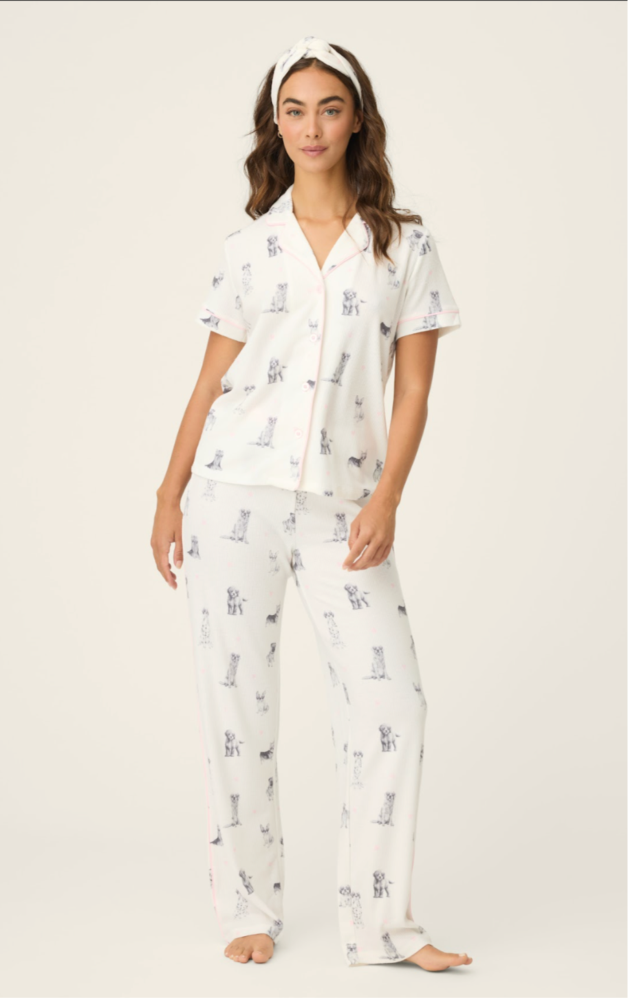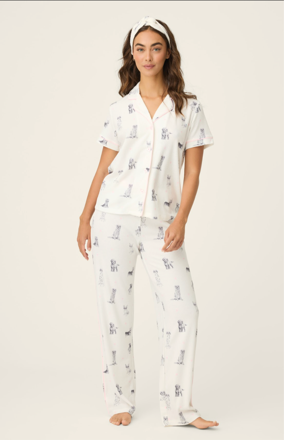 Women’s two-piece pajama set in soft ivory with allover Valentine dog print