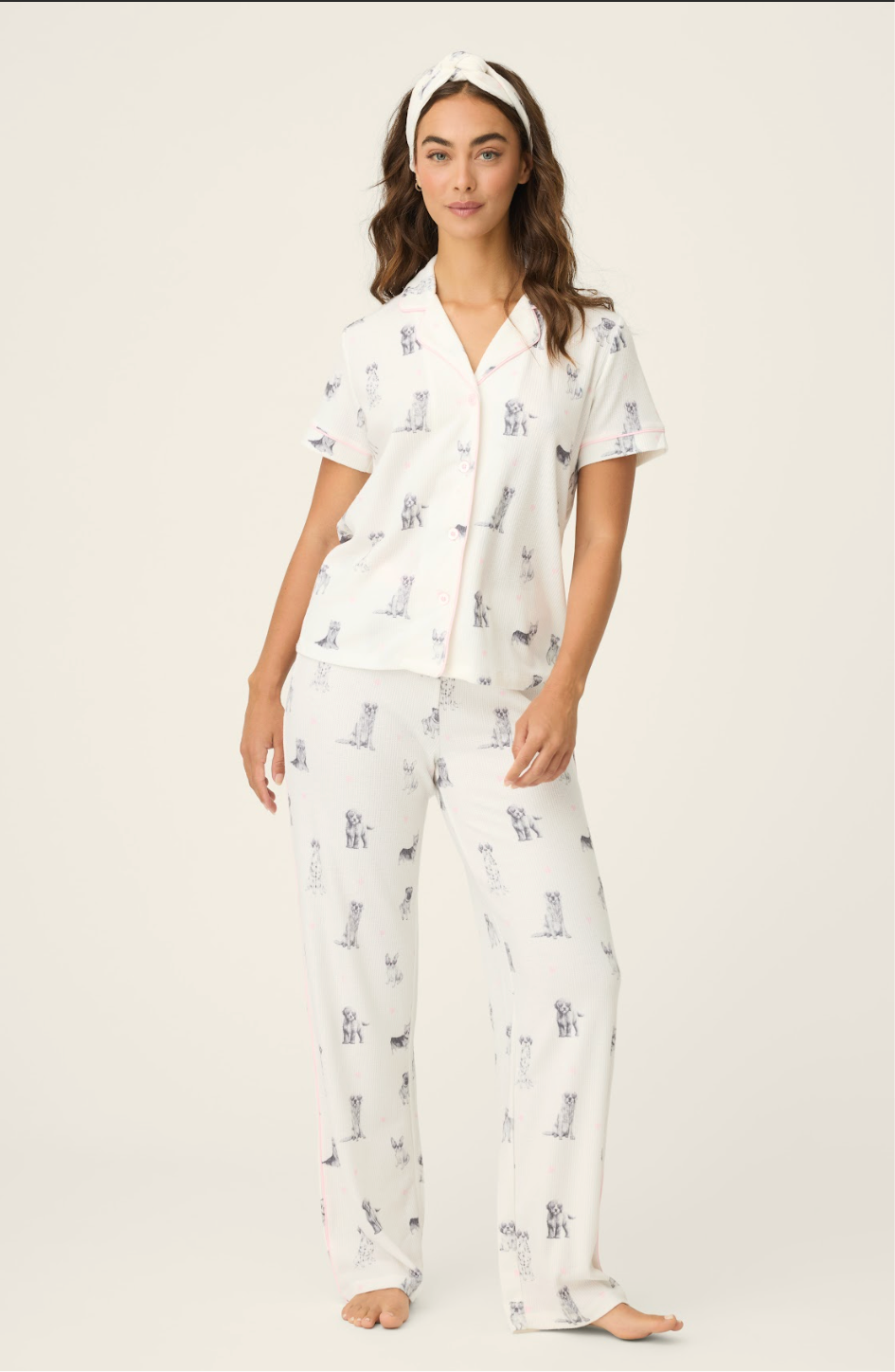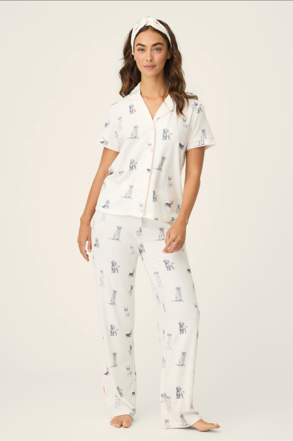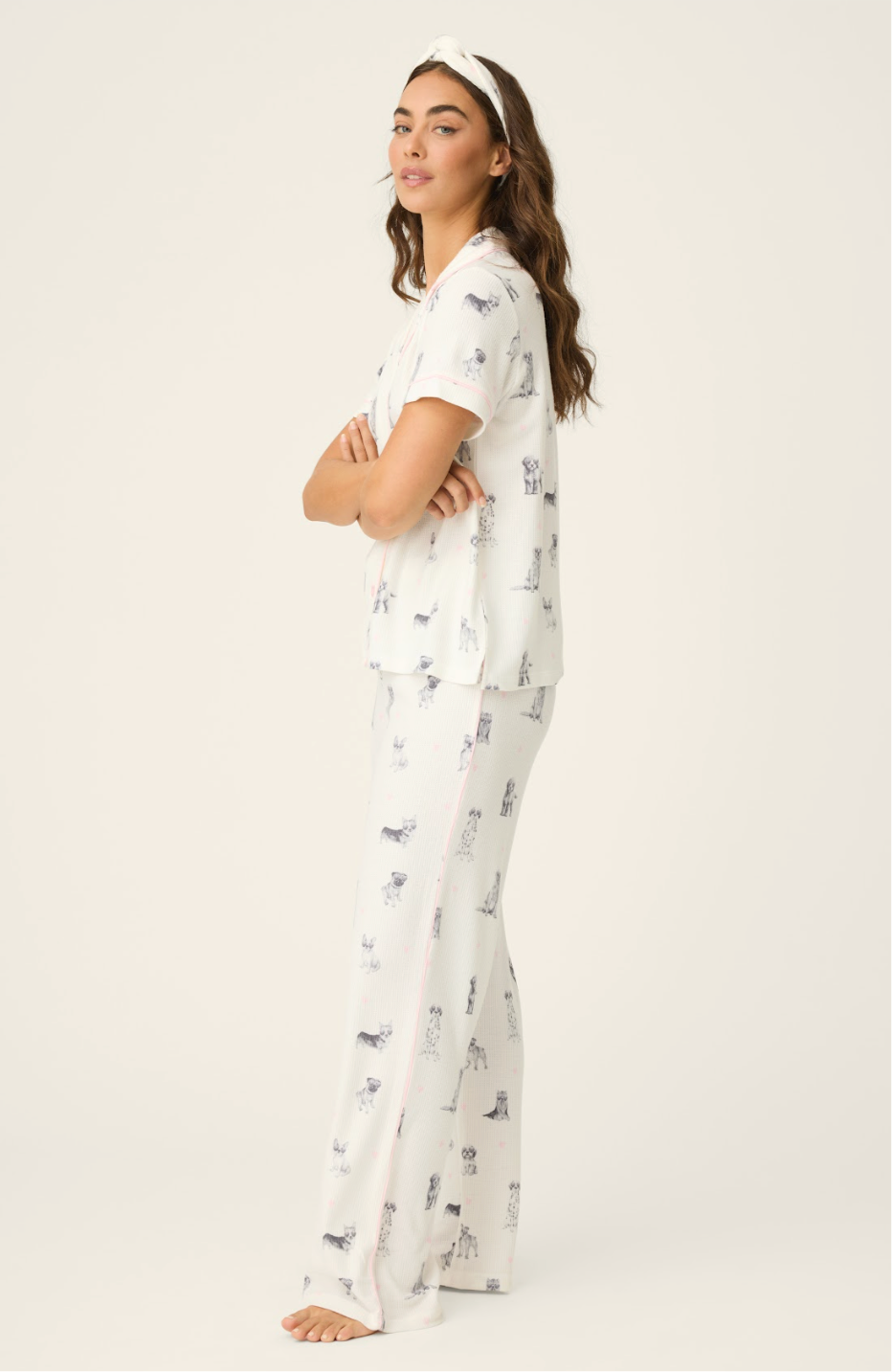 Women’s two-piece pajama set in soft ivory with allover Valentine dog print