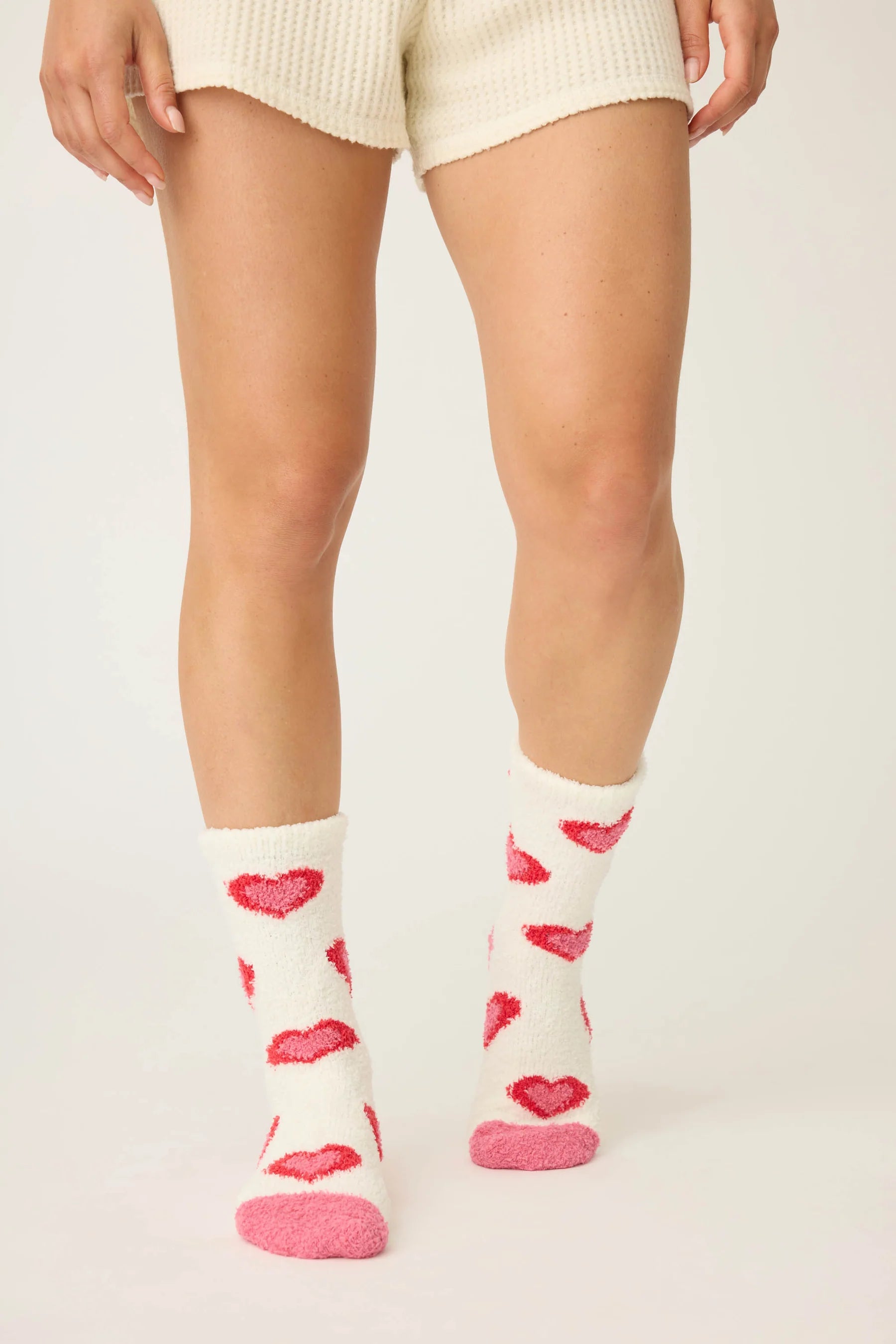 Full of heart, these fuzzy crew socks add a sweet touch to your lounge lineup. Finished with contrast heels and toes and gripper soles, they keep feet cozy and secure.