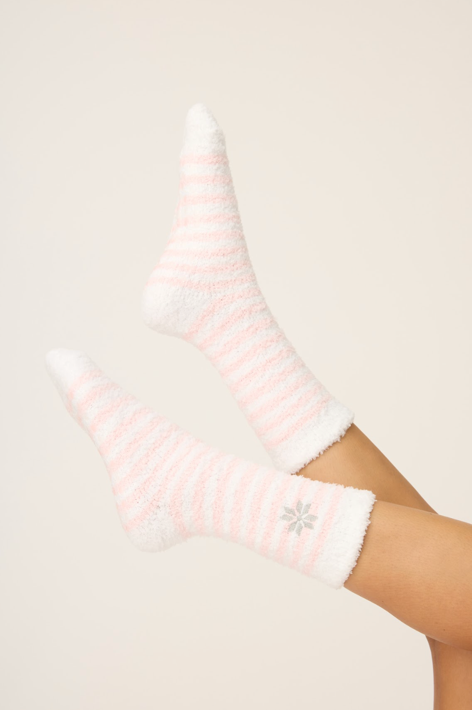 Women’s fuzzy crew socks in white and pastel pink stripes with embroidered snowflake detail and gripper bottoms.