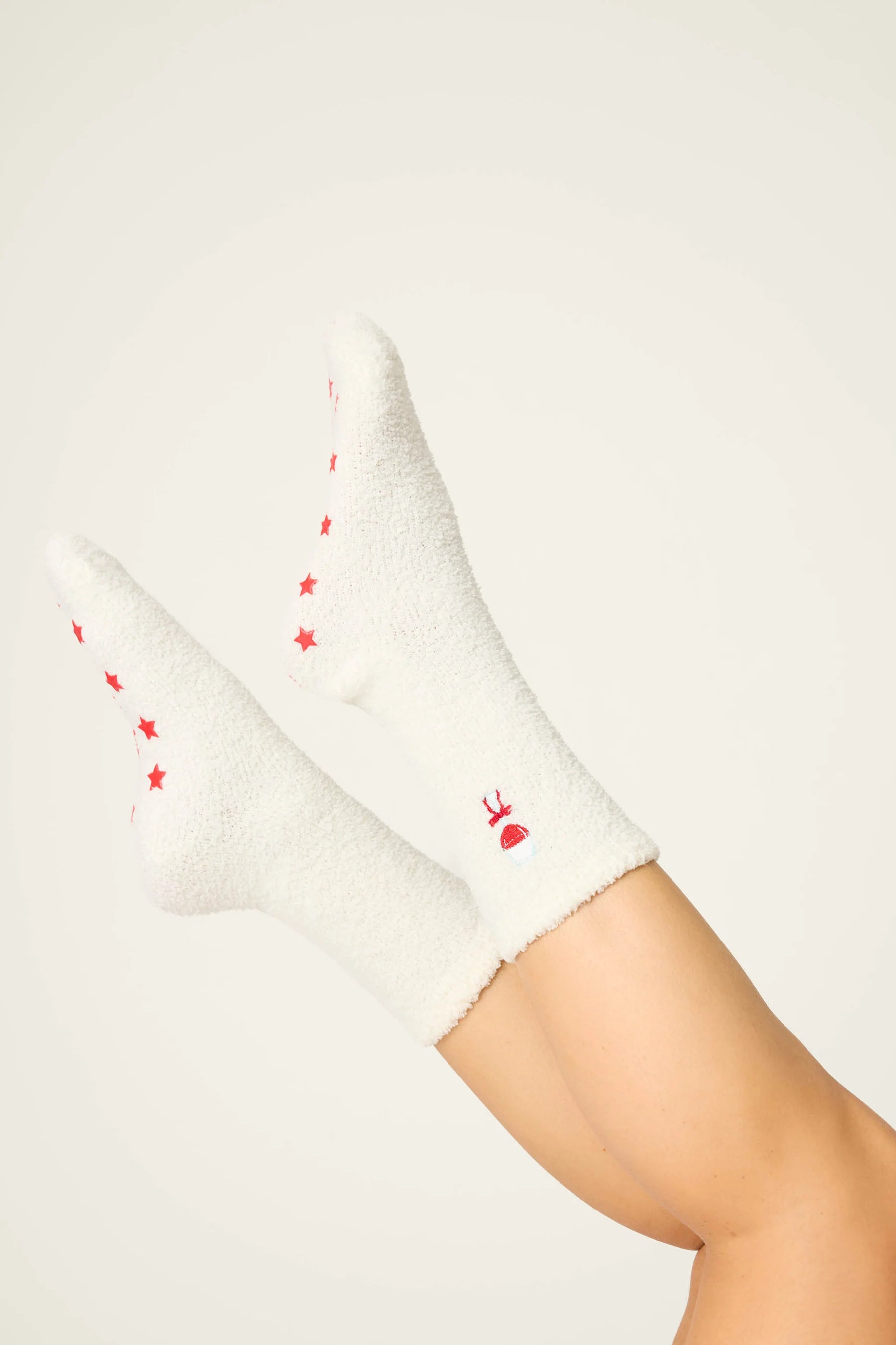Holiday Toast Fuzzy Crew Socks bring festive cheer to every cozy moment. Crafted from soft, plush knit, they feature embroidered champagne glasses and non-slip gripper bottoms—perfect for lounging, gifting, or celebrating the season.
