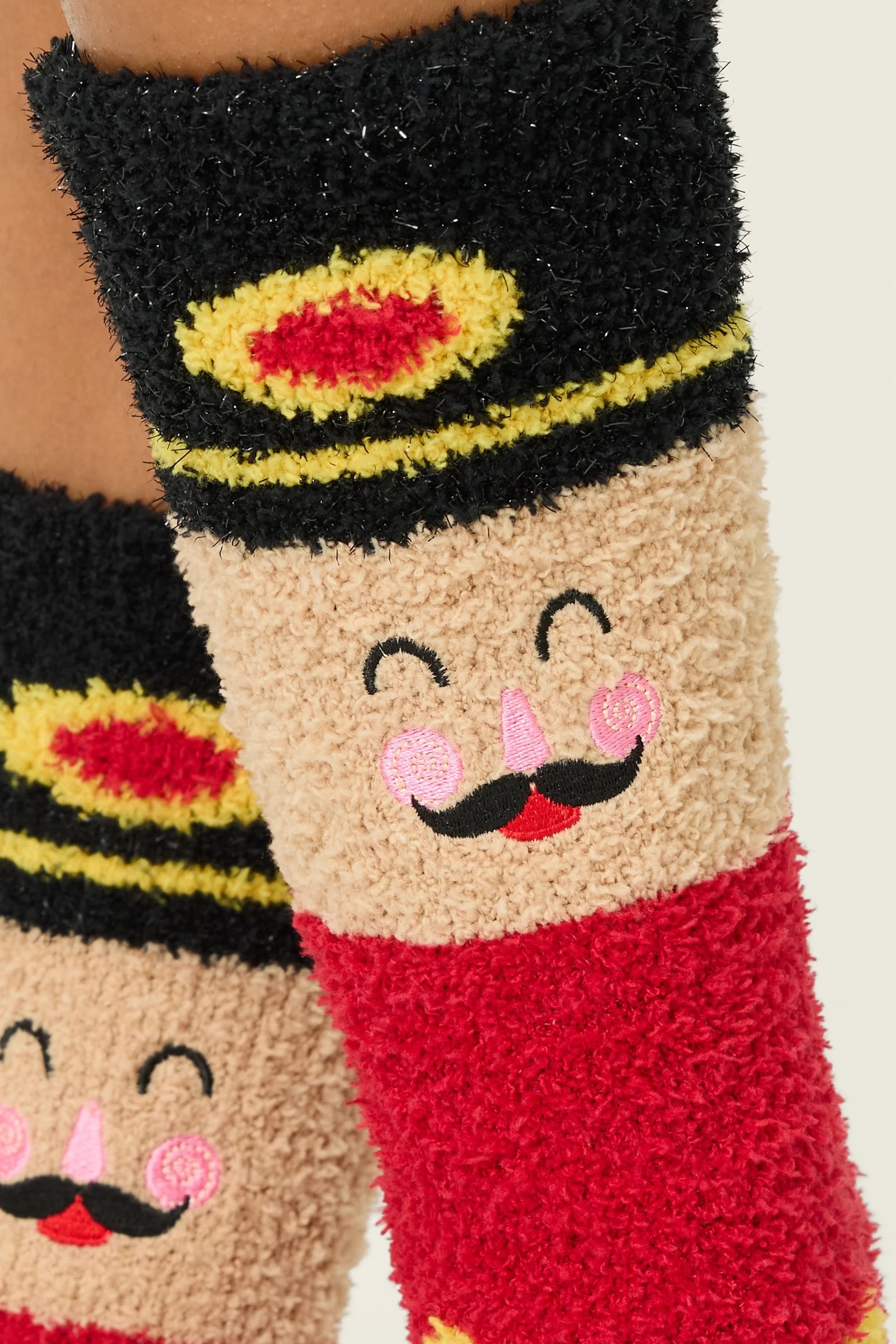 Nutcracker Fuzzy Gripper Socks add festive flair to holiday lounging. Crafted from soft red plush, they feature a nutcracker face with gold uniform accents, black boots, and pink cheek details, finished with non-slip gripper soles.