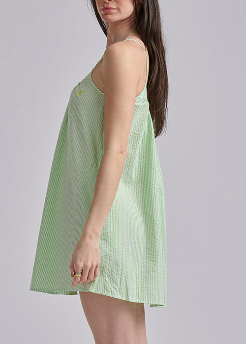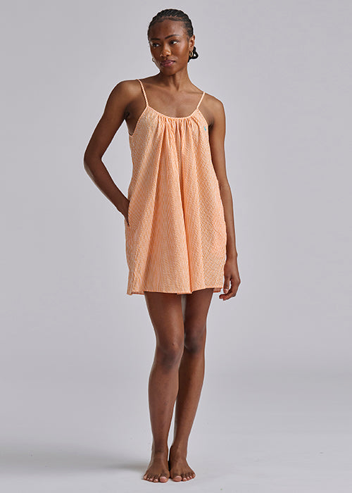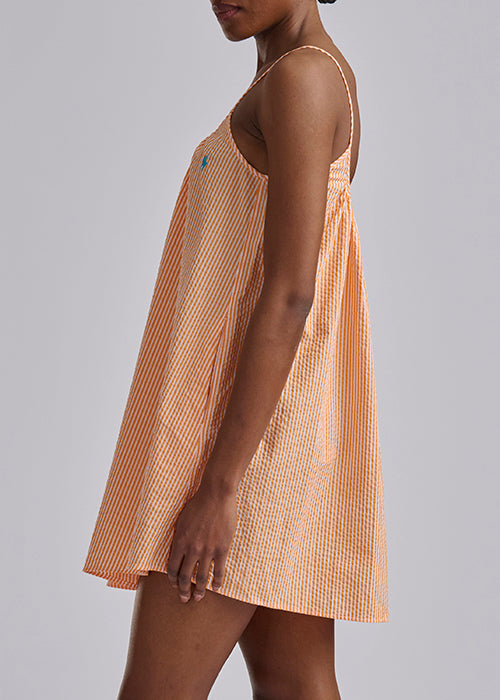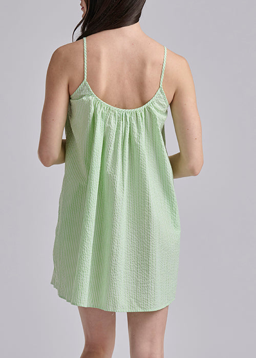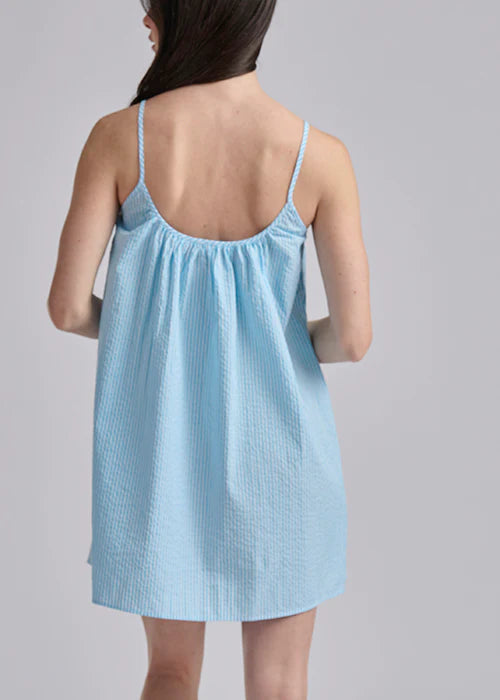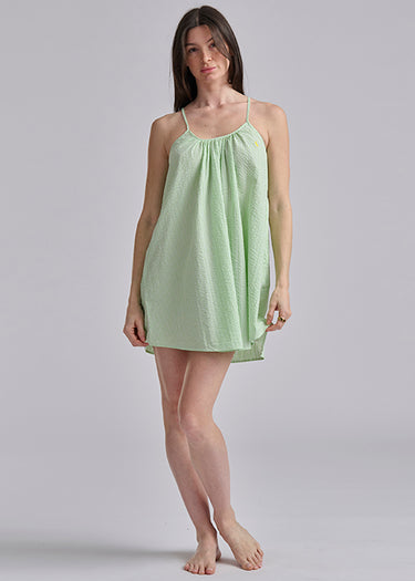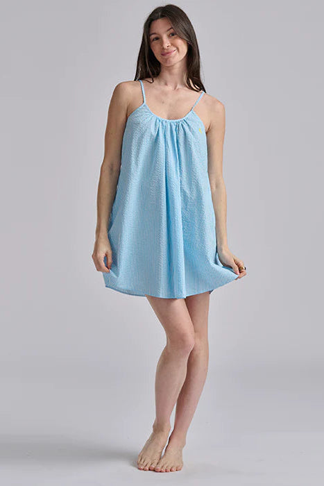 Crafted from 100% cotton, this lightweight seersucker dress is designed for effortless comfort. Featuring a relaxed, airy fit with delicate straps and a softly gathered neckline, it’s cool, breathable, and easy to wear. Perfect for sleeping or lounging, this piece delivers laid-back ease with a gently feminine feel.