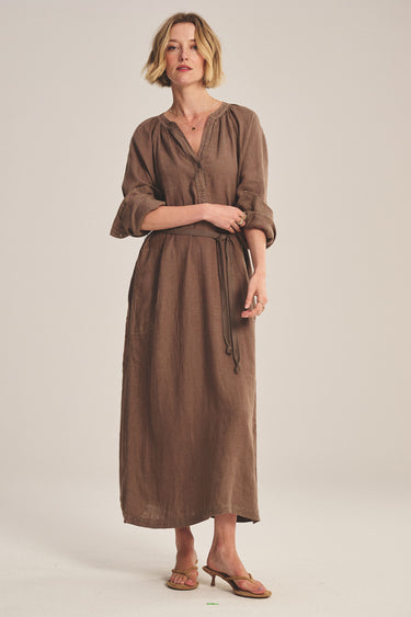 Effortlessly refined and timelessly feminine, the Dakota Dress is crafted from 100% breathable linen for a naturally airy feel. Designed with a relaxed silhouette, it features a soft V-neckline, subtle gathering at the shoulders, and three-quarter length sleeves for understated elegance.