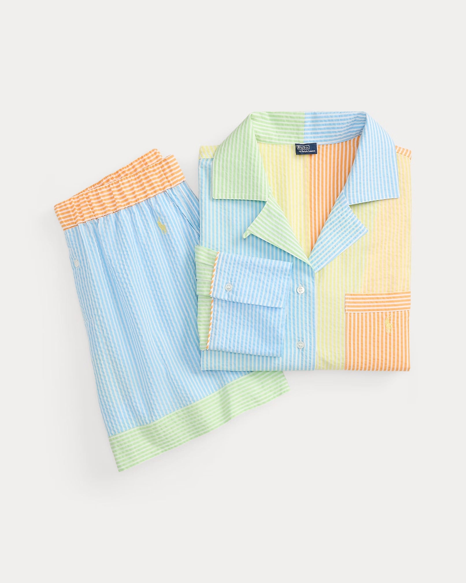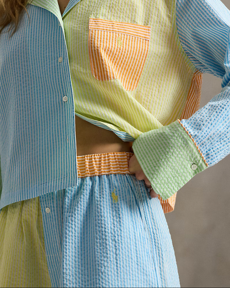 Inspired by Ralph Lauren’s iconic Fun Shirt, this cotton seersucker pajama set features a vibrant yarn-dyed striped motif for a timeless yet playful look.