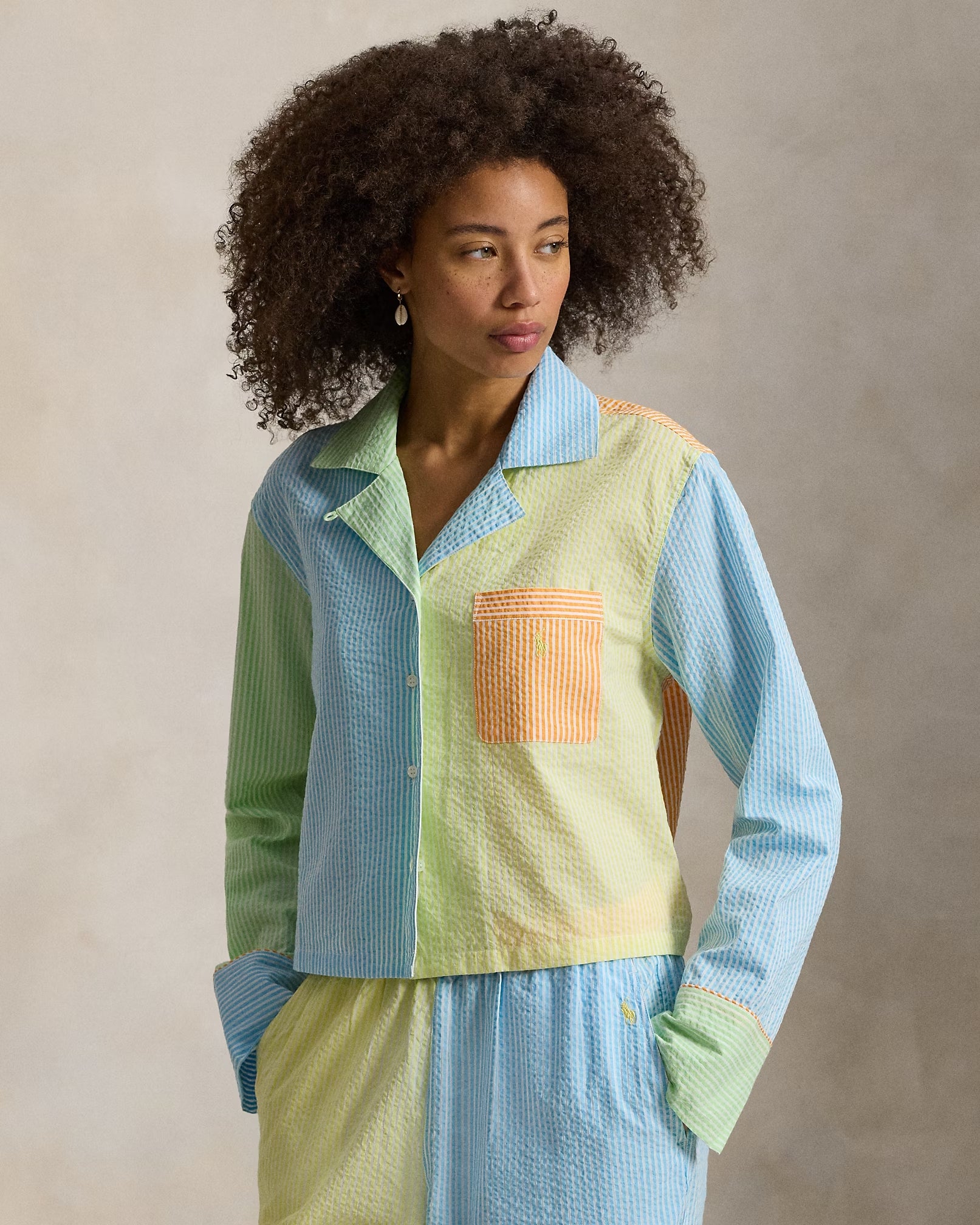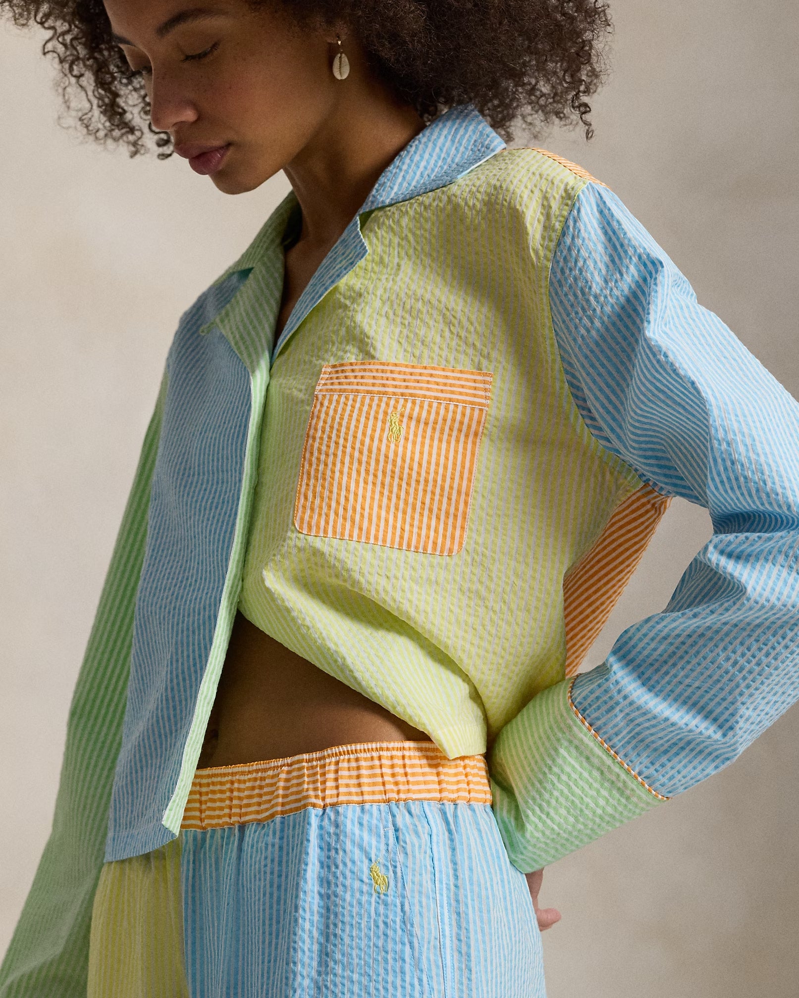Inspired by Ralph Lauren’s iconic Fun Shirt, this cotton seersucker pajama set features a colorful yarn-dyed striped motif for a fresh, timeless look. Crafted from 100% breathable cotton, the lightweight seersucker texture keeps it cool and comfortable for sleeping or lounging
