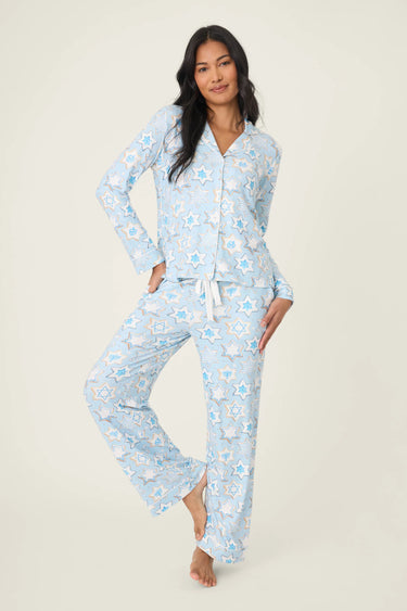 Soft, festive, and perfect for cozy nights in, this Hanukkah PJ set brings playful charm to holiday evenings. Made from buttery-soft jersey, the button-up top and matching pants feature an allover Star of David cookie print on a soft wintery blue base. Classic piping, a drawstring waist, and a relaxed fit make it ideal for gifting or enjoying your own seasonal celebrations.